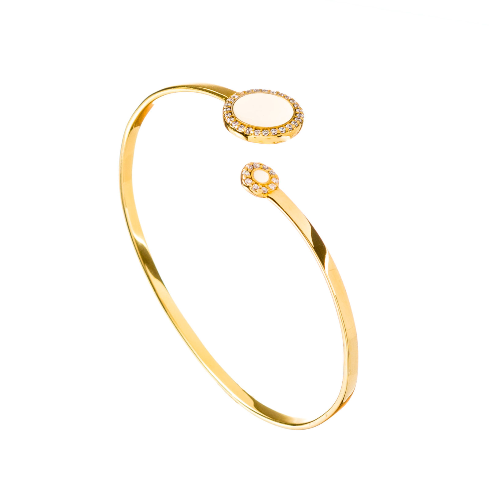 Βραχιόλι στητό από ασήμι 925 επιχρυσωμένο, με ένα μεγάλο και ένα μικρό στρογγυλό μοτίφ, ιβουάρ σμάλτο και λευκά ζιργκόν.
