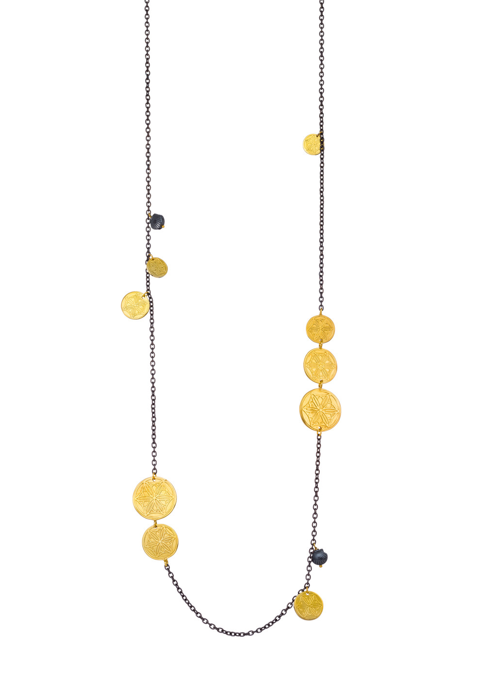 Κολιέ με το Ρόδο της Αφροδίτης από ορείχαλκο με διακοσμητικά αχιβάδες από αιματήτη και μαύρη καδένα, μήκους 90 cm.